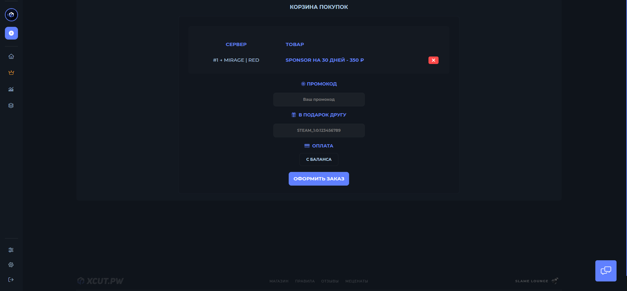 В корзине Вы можете выбрать, для кого вы покупаете услугу, для себя или в подарок. Если Вы покупаете для себя, то в графе «STEAM-ID» ничего не заполняйте, если покупаете для другого игрока, то введите его STEAM ID в формате STEAMID32, первый вариант на скриншоте ниже, как пример STEAM_0:1:605485392. Узнать можно на сайте Узнать STEAM ID или на аналогичных сервисах конвертации STEAM ID.