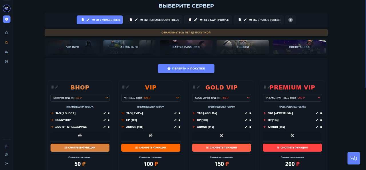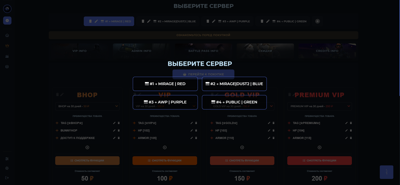 После пополнения баланса на сайте, перейдите в Магазин привилегий, выберите сервер, на котором хотите приобрести привилегию (либо любой другой товар)